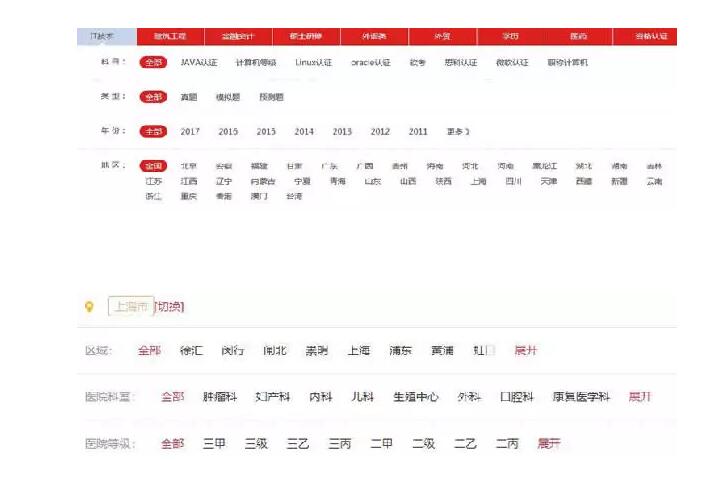 篩選導(dǎo)航一般蘊(yùn)含著大量的頁面,顯而易見,因?yàn)榻M合很多,尤其像上圖這種多個(gè)分類以及節(jié)點(diǎn)篩選,算上“全部”:科目有9個(gè)、類型有4個(gè)、年份有8個(gè)、地區(qū)35個(gè),那么簡單一算,可組合出的頁面數(shù)量有9x4x8x35=10080(數(shù)學(xué)學(xué)不好,加減乘除來湊巧),篩選導(dǎo)航上還有大類,如“建筑工程”,“金融會計(jì)”…等,單獨(dú)“電腦IT”類10萬+頁面是沒什么問題了,那么如果一個(gè)教育培訓(xùn)網(wǎng)站還有“語言培訓(xùn)”,“學(xué)歷文憑”等…數(shù)據(jù)量就很恐怖了。